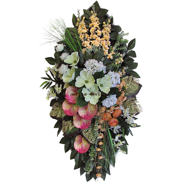 Венок из искусственных цветов. Основа венка: металлический каркас  сварной. Каркас оплетён искусственным ершом высокой плотности тёмно-зелёного цвета, длина иголки не менее 40 мм и искусственной ёлкой тёмно-зелёного цвета. Высота венка  170см без ножек.