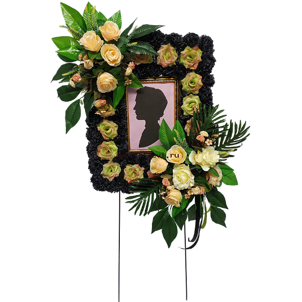 Венок - рамка. На трех высоких ножках. Одна ножка складная. Предназначен для установки рядом с гробом или рядом с крестом на могиле.